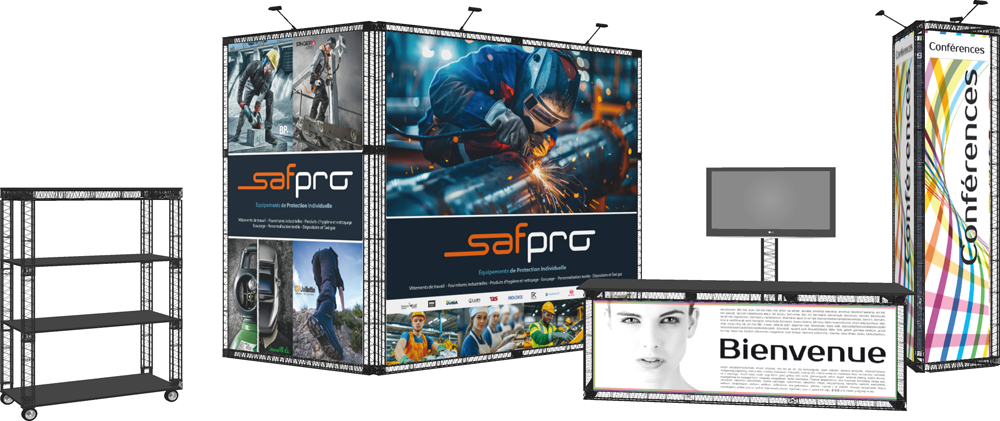 Notre expérience du monde industriel, nous a permis d’être d’une flexibilité à toute épreuve, comme nos structures. Avec celles-ci, et pour un prix très abordable, vous disposerez un stand moderne et singulier.